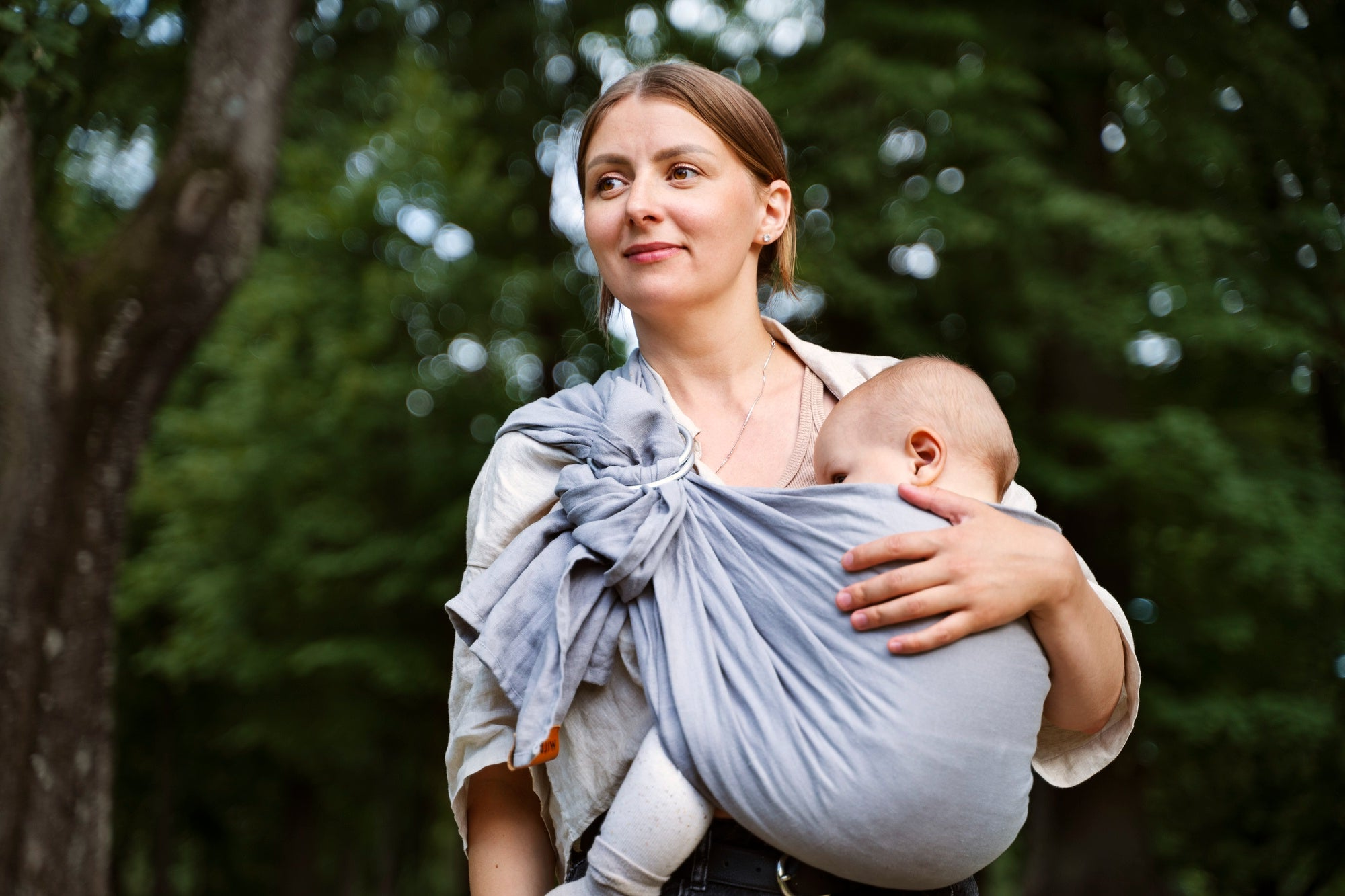 L’Écharpe De Portage CottonRingSling™ associe le confort du coton et du lin à la praticité des anneaux métalliques pour un ajustement rapide.